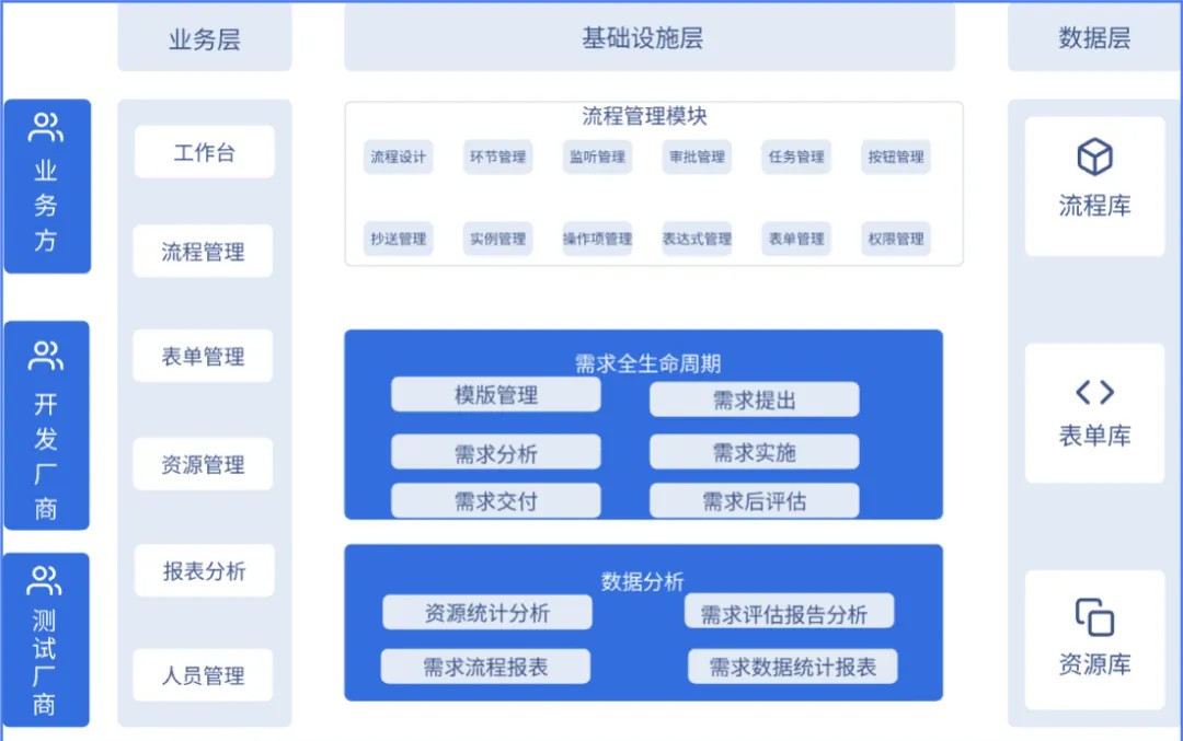 ● 需求全生命周期管控:通过需求管理平台,对各类需求从提出、分析、评估、实施、上线等环节进行精细化管控。保证了需求实施交付的规范化。